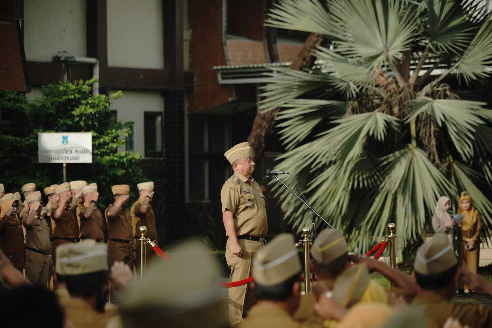 SuaraGarut.id – Bupati Garut Abdusy Syakur Amin memimpin Apel Gabungan di lingkungan Pemerintah Kabupaten Garut yang digelar di Lapangan Sekretariat Daerah (Setda), Jalan Pembangunan, Senin (9/2/2026). Dalam kesempatan tersebut, Bupati menyoroti isu penghapusan kepesertaan Penerima Bantuan Iuran (PBI) jaminan kesehatan serta menekankan pentingnya etos kerja aparatur sipil negara, khususnya di bulan Ramadan.