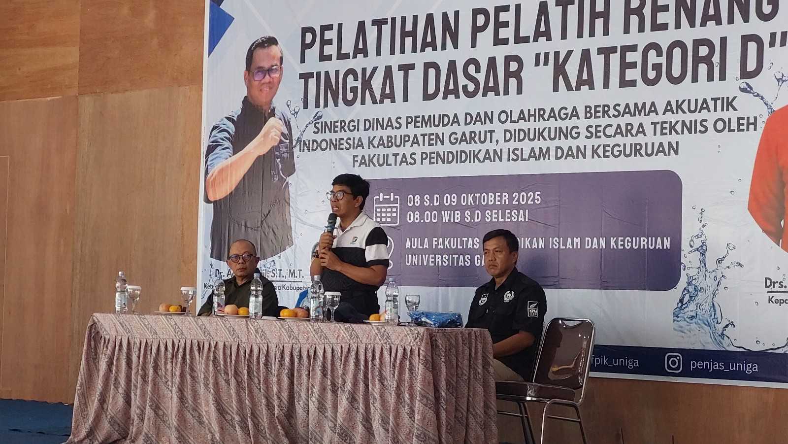 SuraGarut.id – Dinas Pemuda dan Olahraga (Dispora) Kabupaten Garut bekerja sama dengan Akuatik Indonesia Kabupaten Garut serta didukung secara teknis oleh Fakultas Pendidikan Islam dan Keguruan (FPIK) Universitas Garut menggelar Pelatihan Pelatih Renang Tingkat Dasar Kategori D. Kegiatan ini berlangsung selama dua hari, 8–9 Oktober 2025, di Aula Gedung FPIK Uniga Garut.