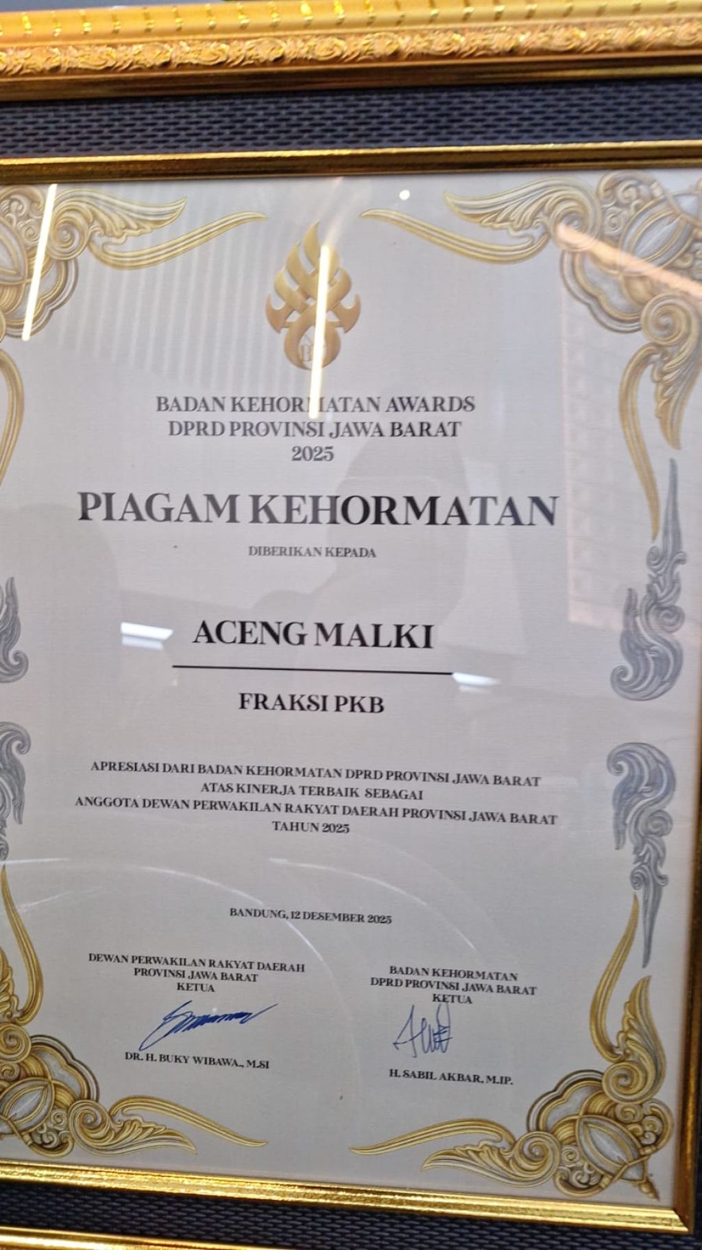 Penghargaan ini diberikan sebagai bentuk apresiasi atas komitmen, integritas, serta kualitas pelaksanaan tugas kedewanan yang dinilai menonjol selama setahun terakhir. Selain menerima trofi, Aceng Malki juga mendapatkan Piagam Kehormatan yang ditandatangani oleh Ketua DPRD Jawa Barat dan Ketua Badan Kehormatan DPRD Jawa Barat.
