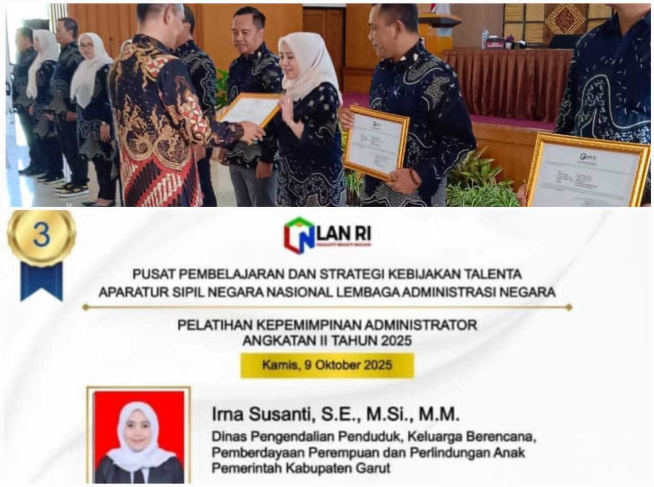 SuaraGarut.id – Kepala Bidang Keluarga Berencana pada Dinas Pengendalian Penduduk, Keluarga Berencana, Pemberdayaan Perempuan, dan Perlindungan Anak (DP2KBPPPA) Kabupaten Garut, Irna Susanti, S.E., M.Si., M.M., mencatat prestasi membanggakan di tingkat nasional. Ia berhasil meraih peringkat ketiga dalam Pelatihan Kepemimpinan Administrator (PKA) Angkatan II Tahun 2025 yang diselenggarakan oleh Lembaga Administrasi Negara Republik Indonesia (LAN RI).