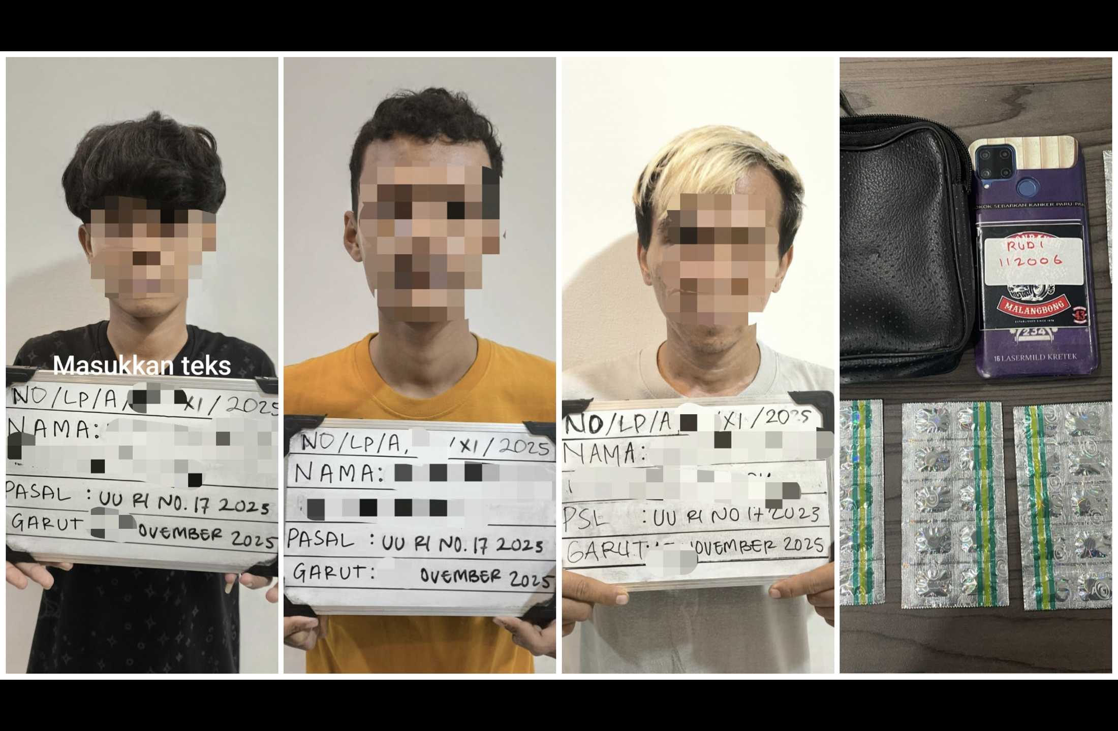 Kasat Reserse Narkoba Polres Garut, AKP Usep Sudirman, S.H., menyampaikan bahwa dari para pelaku berhasil diamankan ratusan butir obat keras yang diduga jenis Tramadol dan Trihexyphenidyl, serta barang bukti lainnya seperti uang tunai dan telepon genggam yang diduga digunakan untuk transaksi.